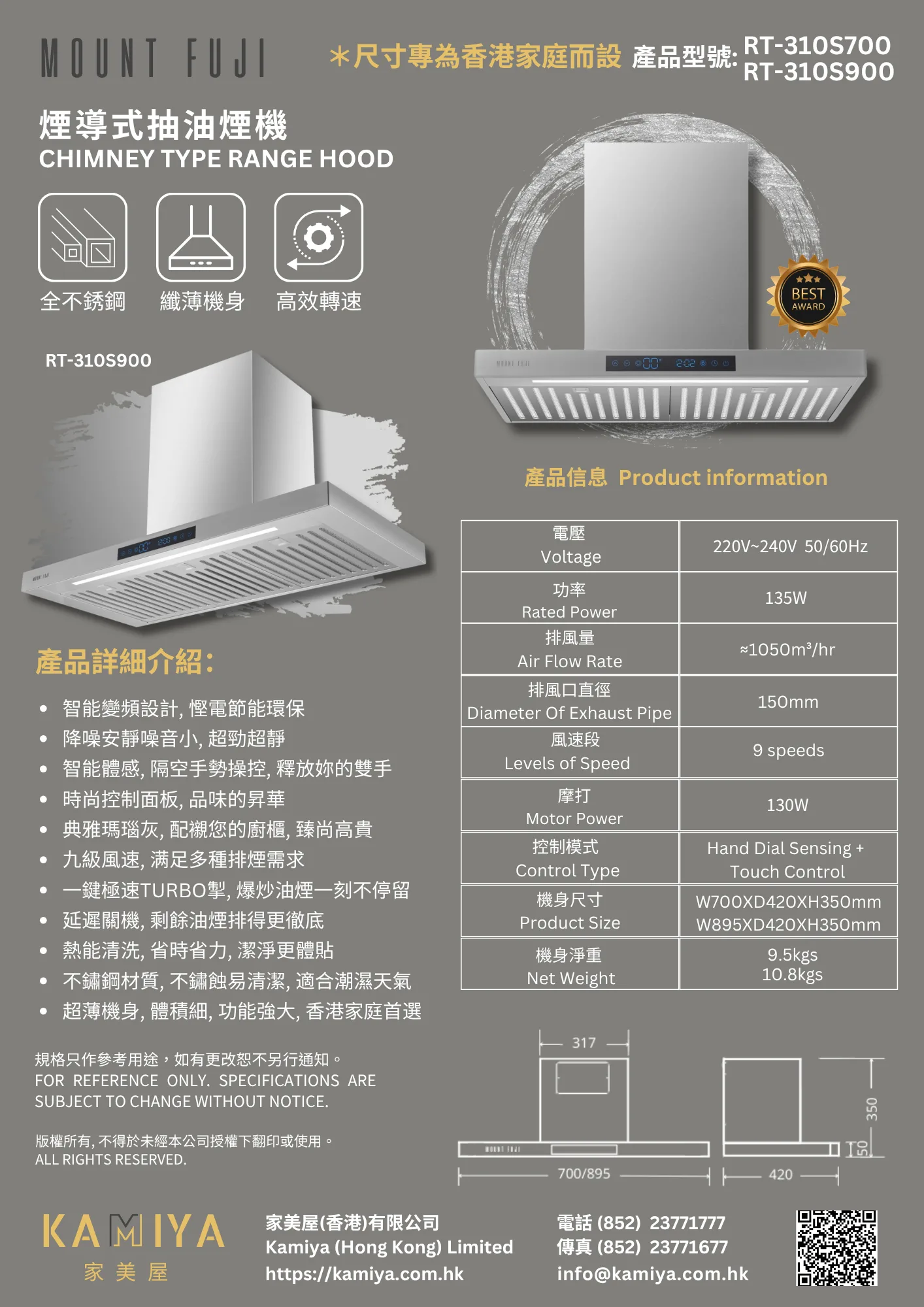 Mount Fuji RT-310S700‧700mm 極「智」變頻‧煙導式抽油煙機‧體感操控‧香港行貨,原廠1年保養,摩打3年保養‧