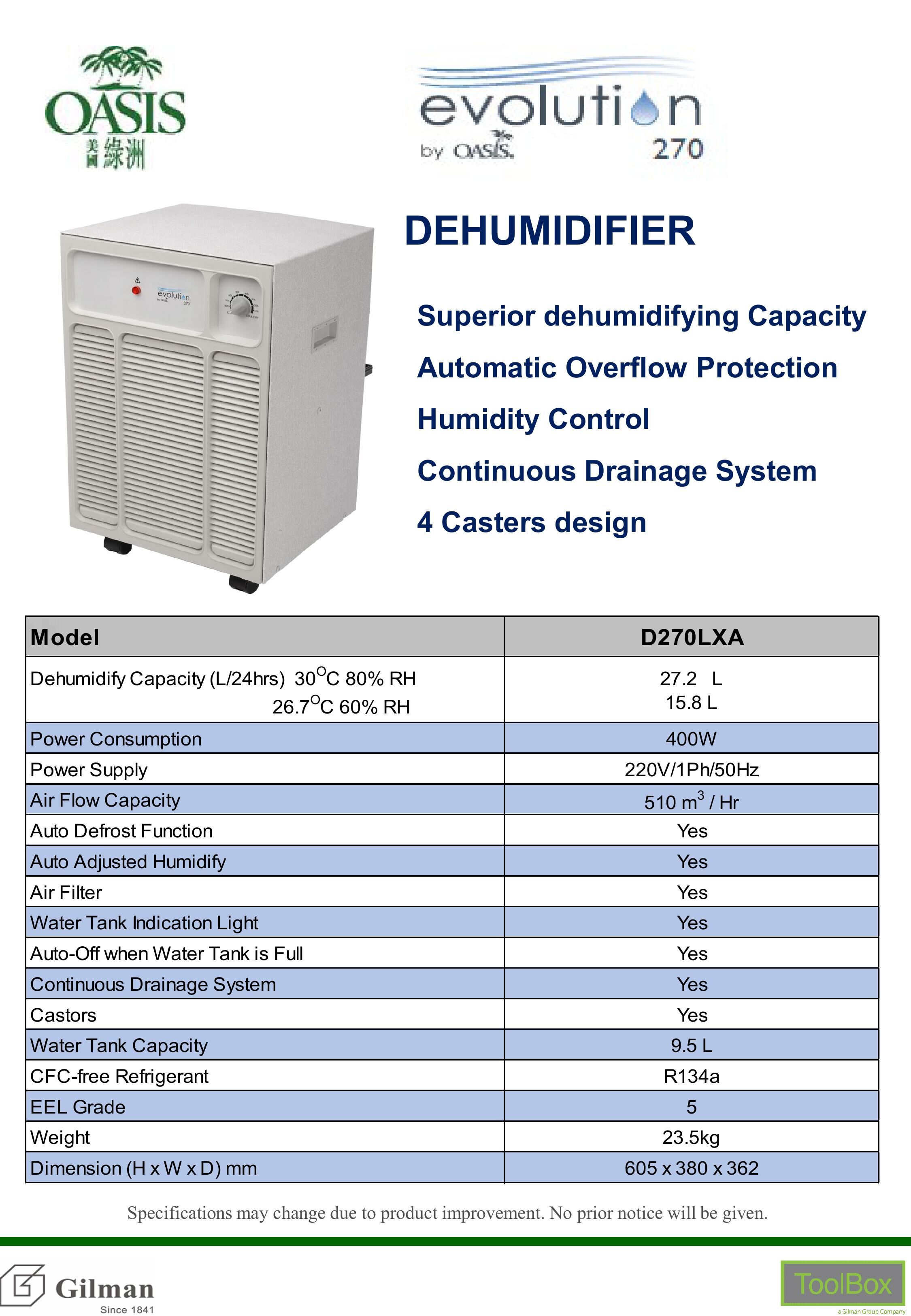 綠州 OASIS D270LXA‧抽濕機‧27.2升/日‧波蘭製造‧香港行貨,原廠1年全機及5年壓縮機保養‧
