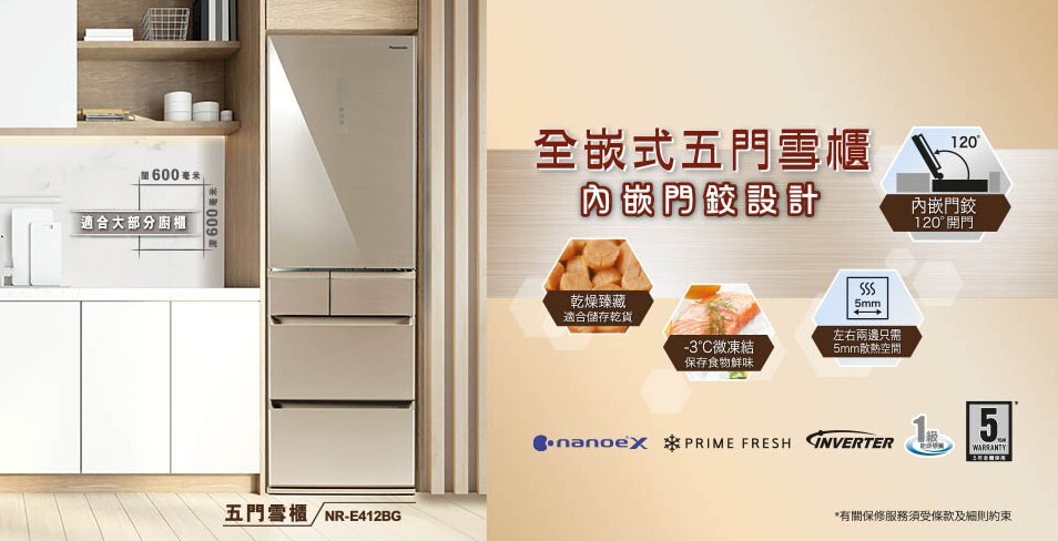 全嵌式五門玻璃設計 "變頻式" 雪櫃
