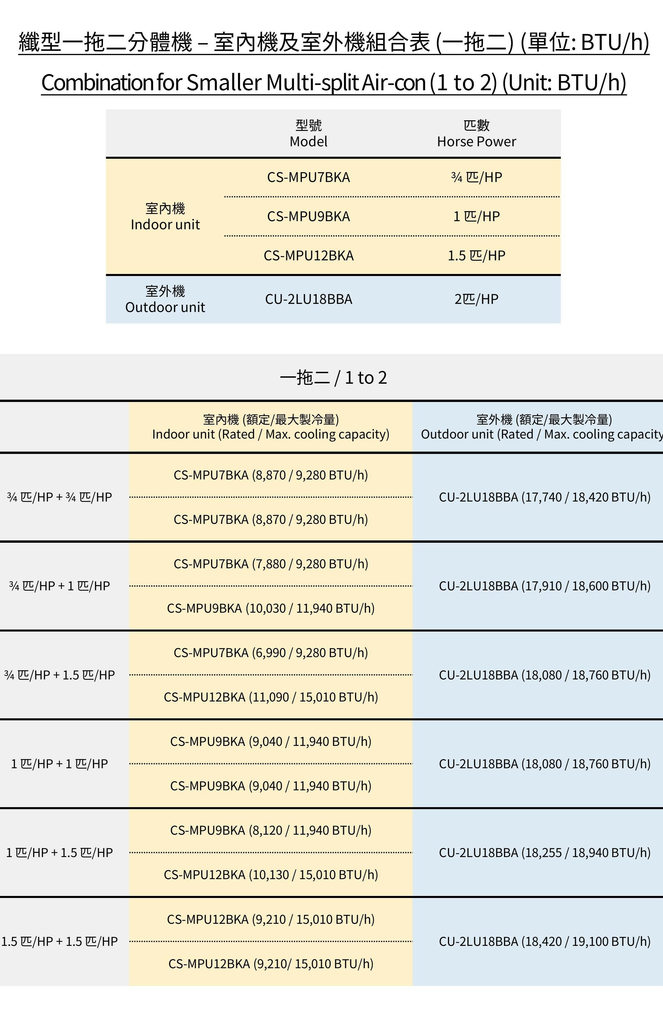 室內機自由組合 (最大總輸出為2匹)