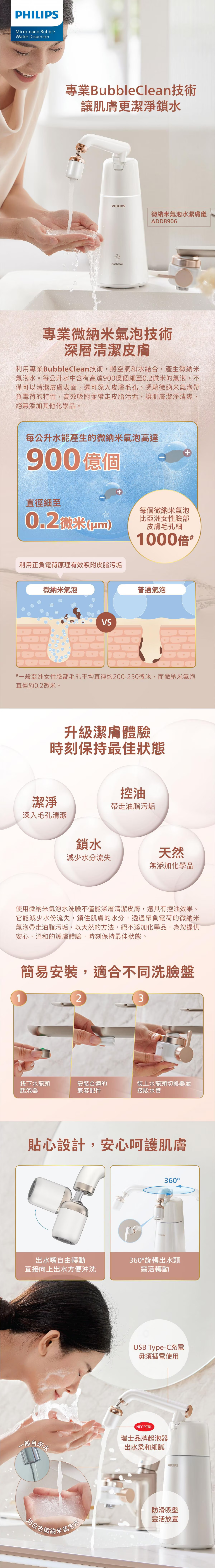 BubbleClean 技術將空氣分解成微納米大小的氣泡並與水混合,令每一升水都富含數以百萬計的小至 200 m* 的超細微氣泡。乳白色的微氣泡水可以滲透毛孔並吸附灰塵、油脂及雜質,帶來深層皮膚清潔效能。