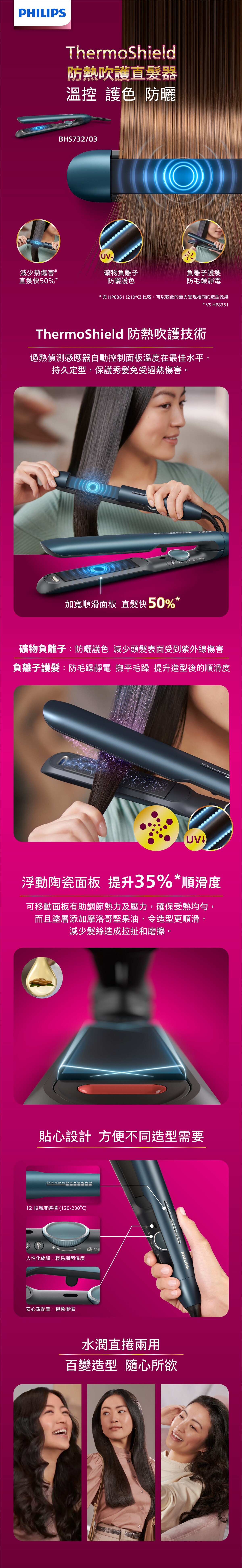 可選溫度範圍為 120°C 至 230°C;能塑造持久造型效果,同時減低秀髮受損的機會。