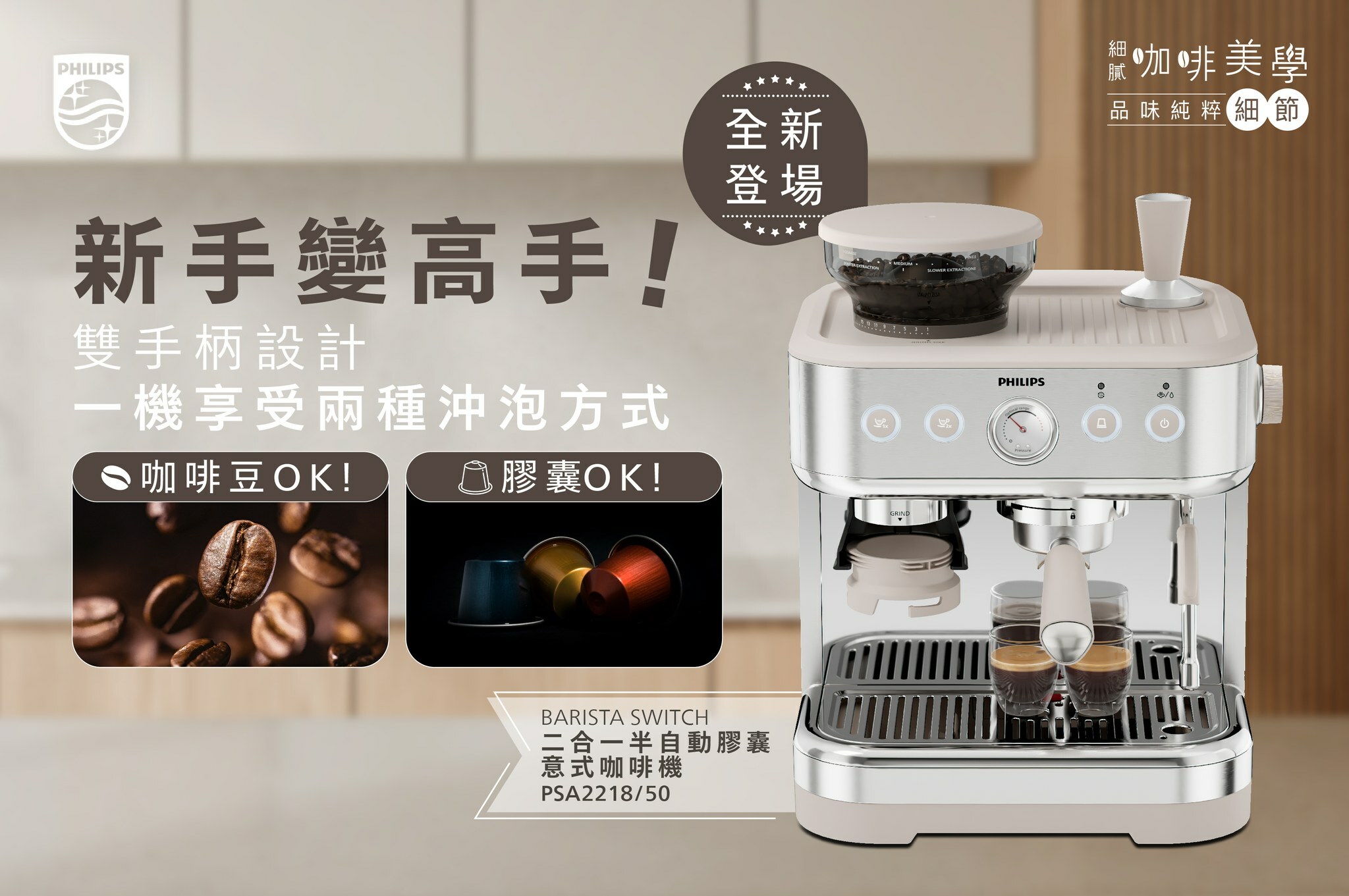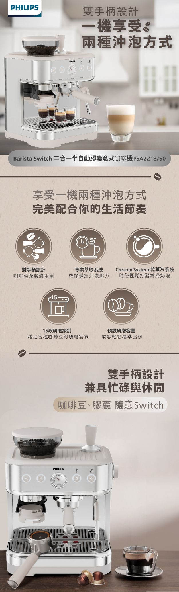 憑藉雙手柄設計,您可以在忙碌的早上輕鬆使用膠囊手柄,快速炮製一杯美味咖啡;在休閒時間,便盡情享受炮製濃縮咖啡的樂趣。