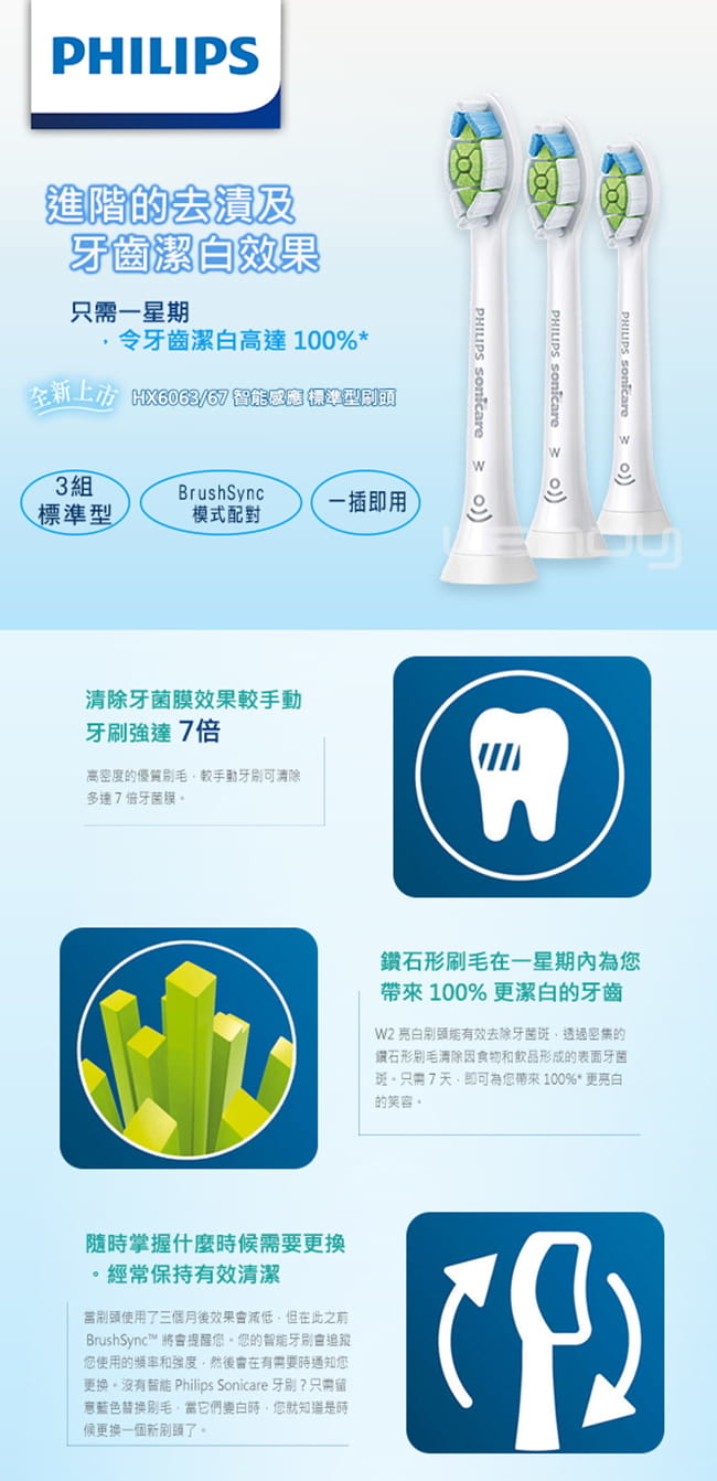 使用 BrushSync™ 智能感應配對刷頭**,獲得最佳的清潔效果。Philips Sonicare W2 亮白刷頭可與配備 BrushSync™ 的 Philips Sonicare 牙刷手柄同步**,然後選擇最佳的刷牙模式和牙刷力度,獲得非一般的潔白效果。您需要做的,就是開始刷牙。