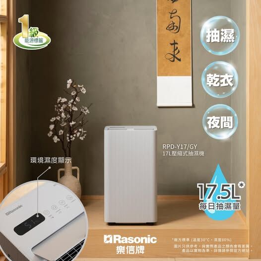 💥New💥 樂信 Rasonic RPD-Y17‧17.5公升/日‧濕度顯示壓縮式抽濕機‧香港行貨,原廠2年保養‧