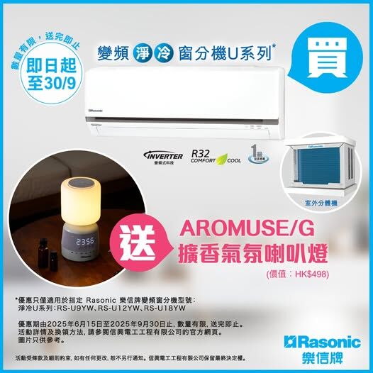顧客凡購買Rasonic樂信牌指定變頻窗分機*,需親自攜帶有效收據(Receipt)/發票(Invoice)正本及保修卡正本,前往以下禮品換領中心進行登記及換領^。登記成功後,將獲取一部Rasonic擴香氣氛喇叭燈(AROMUSE/G)及「RASONIC AROMUSE/G禮品確認信」。憑禮品確認信,顧客可享有該禮品一年之保修服務(由換領日開始計算)。