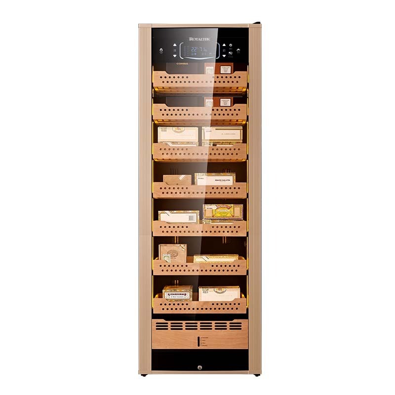 ROYALTEK RT168UC Signature系列恆濕恆溫雪茄櫃,專為雪茄收藏家提供專業級的儲存方案。此雪茄櫃容量巨大,可容納約1200至1500支雪茄,採用高效能的加西貝拉壓縮機制冷技術,確保櫃內環境穩定。溫度控制範圍為16-22℃,濕度則可精準維持在60-80%rh之間,配合精選的西班牙雪松木層架,為您的珍藏雪茄創造最理想的陳年熟成環境。