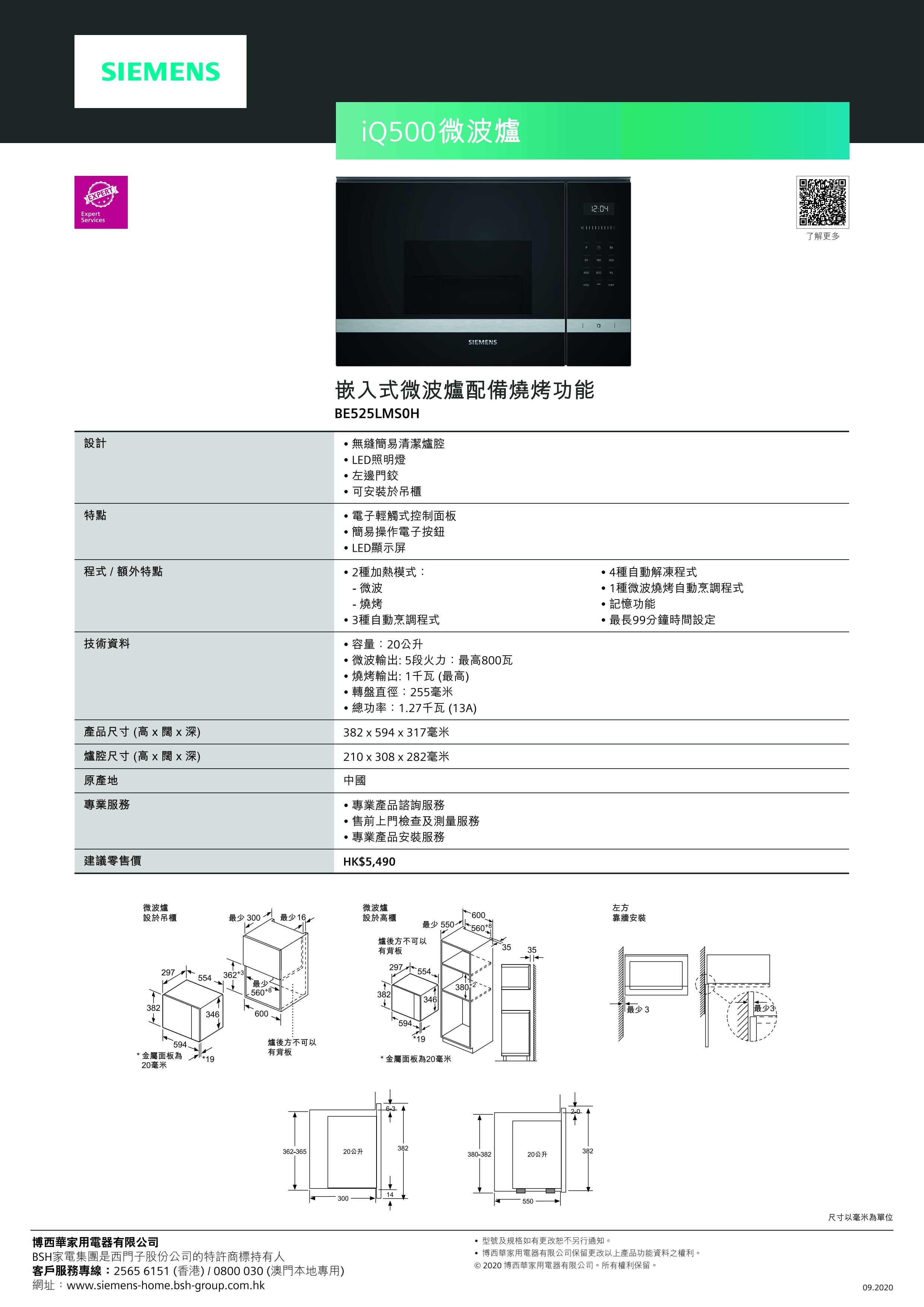 西門子 Siemens BE525LMS0H‧嵌入輕觸式微波爐‧20公升‧香港行貨,原廠1年保養‧