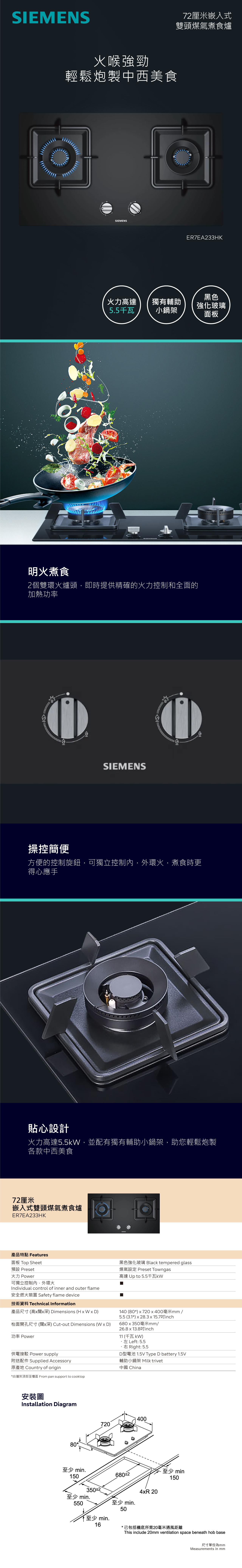 西門子 Siemens ER7EA233HK‧IQ100 720mm 嵌入式雙頭煮食爐‧煤氣‧香港行貨,原廠2年保養‧