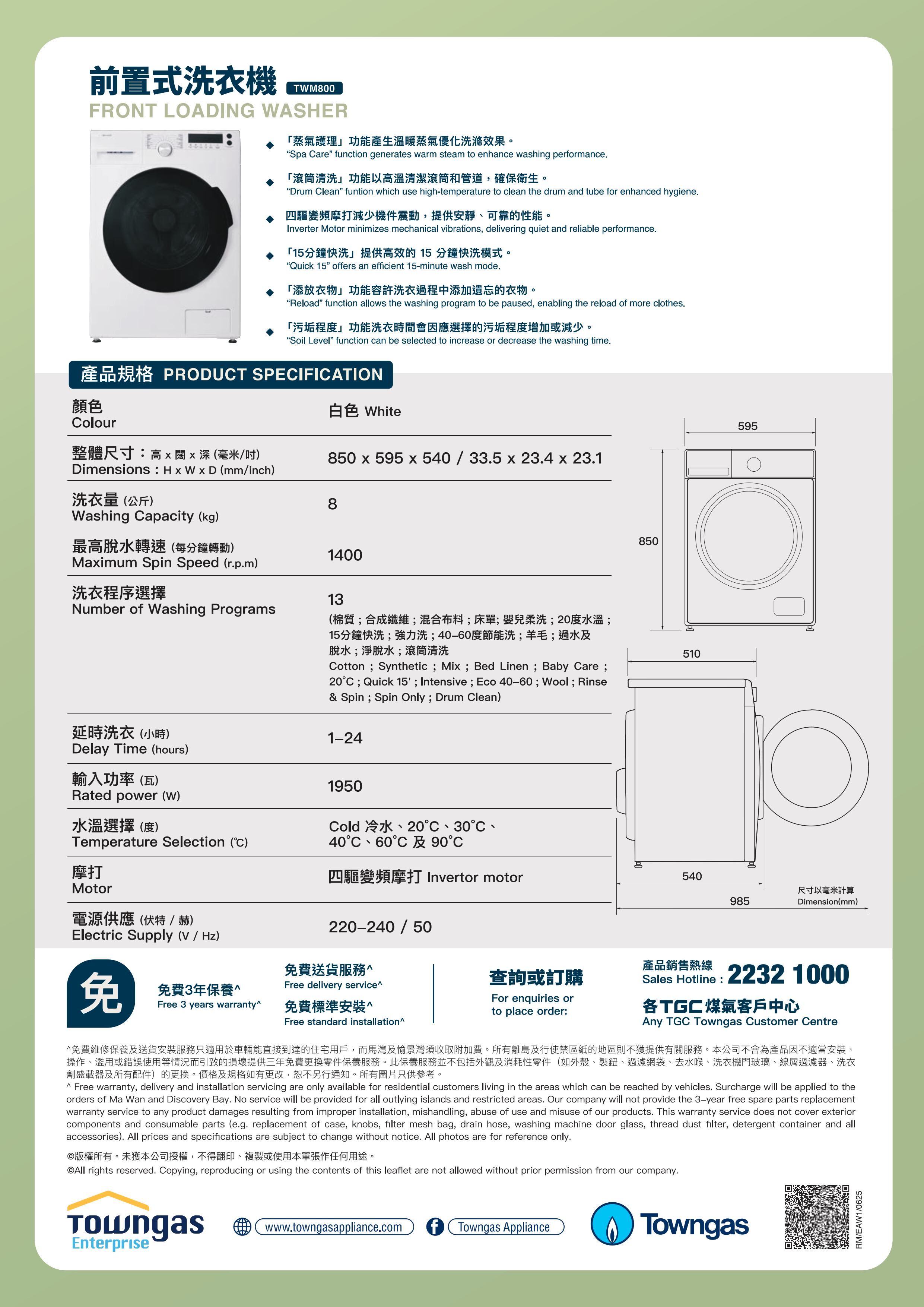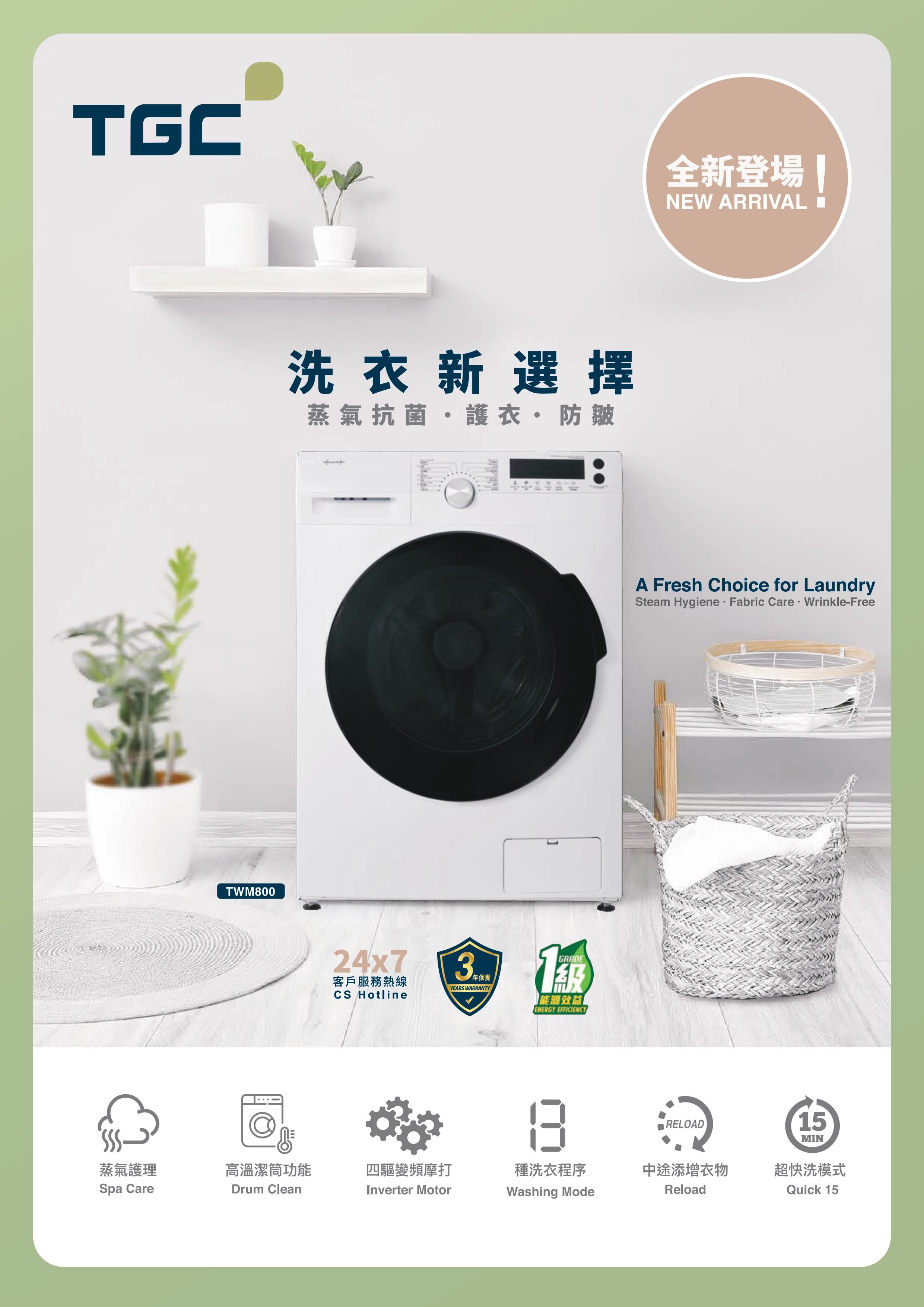 💥New💥 TGC TWM800‧智能變頻蒸氣‧前置式洗衣機‧8KG/1400轉‧香港行貨,原廠3年保養‧