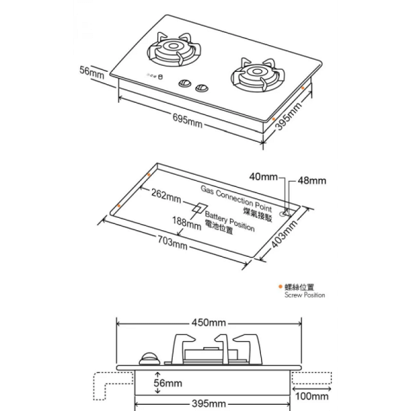 | 整體尺寸至爐架 (高 x 闊 x 深) | 128 x 760 x 450 毫米 | |