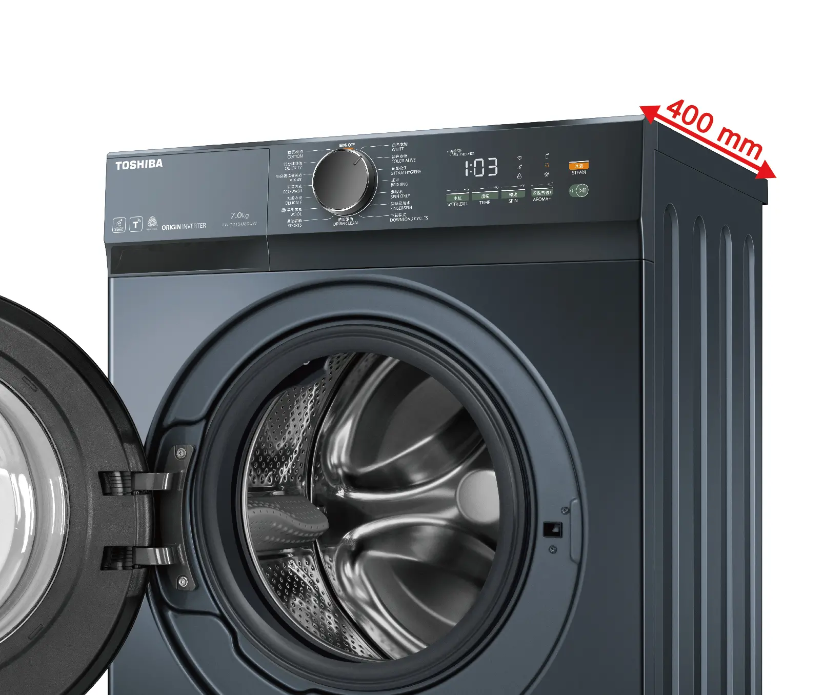 超薄機身纖巧設計,靈活配合各種櫥櫃組合,淨機身尺寸只有400mm深,使搬運洗衣機及安裝變得更輕鬆容易,推薦重視家居空間感的您。