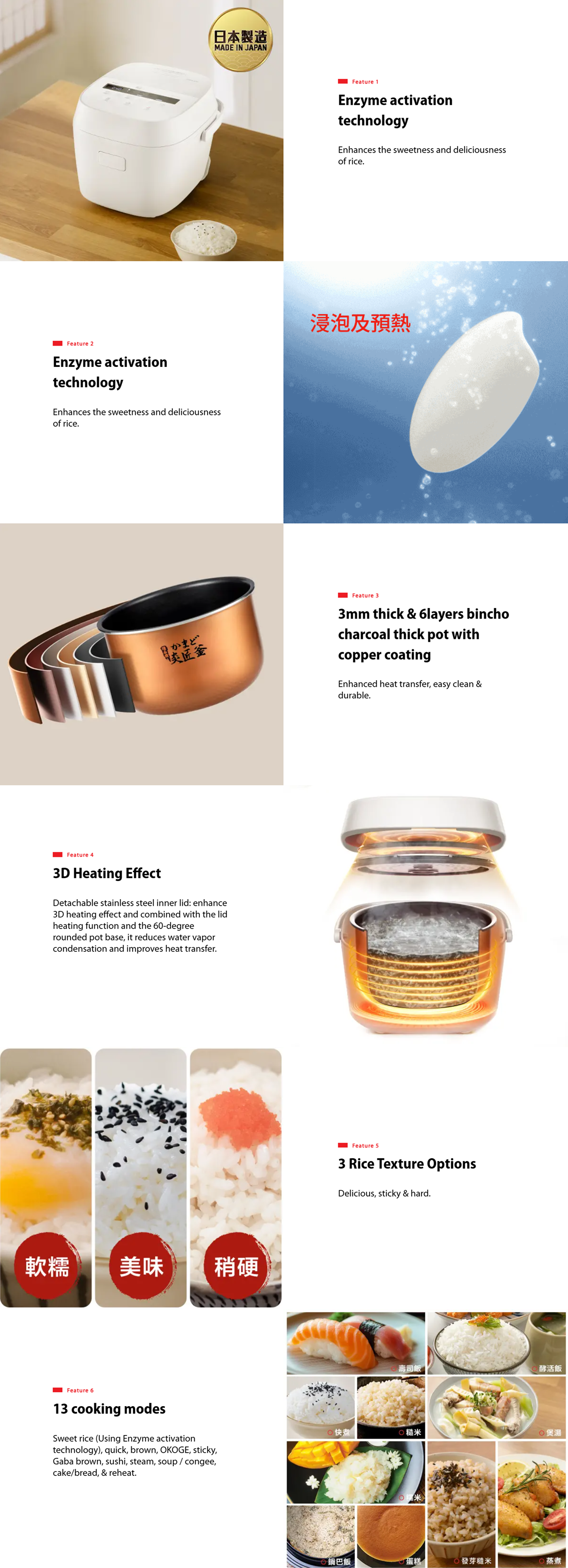 日本製電飯煲,內鍋採用3毫米及6層結構「備長炭炎匠厚釜」,來自日本的備長炭塗層,提高熱力傳遞,煮飯甘香透芯;同時令厚釜防黏易潔,堅固耐用。加上酵素激活技術讓米飯更加香甜可口。並有多種烹調模式,煲湯焗蛋糕一樣方便。