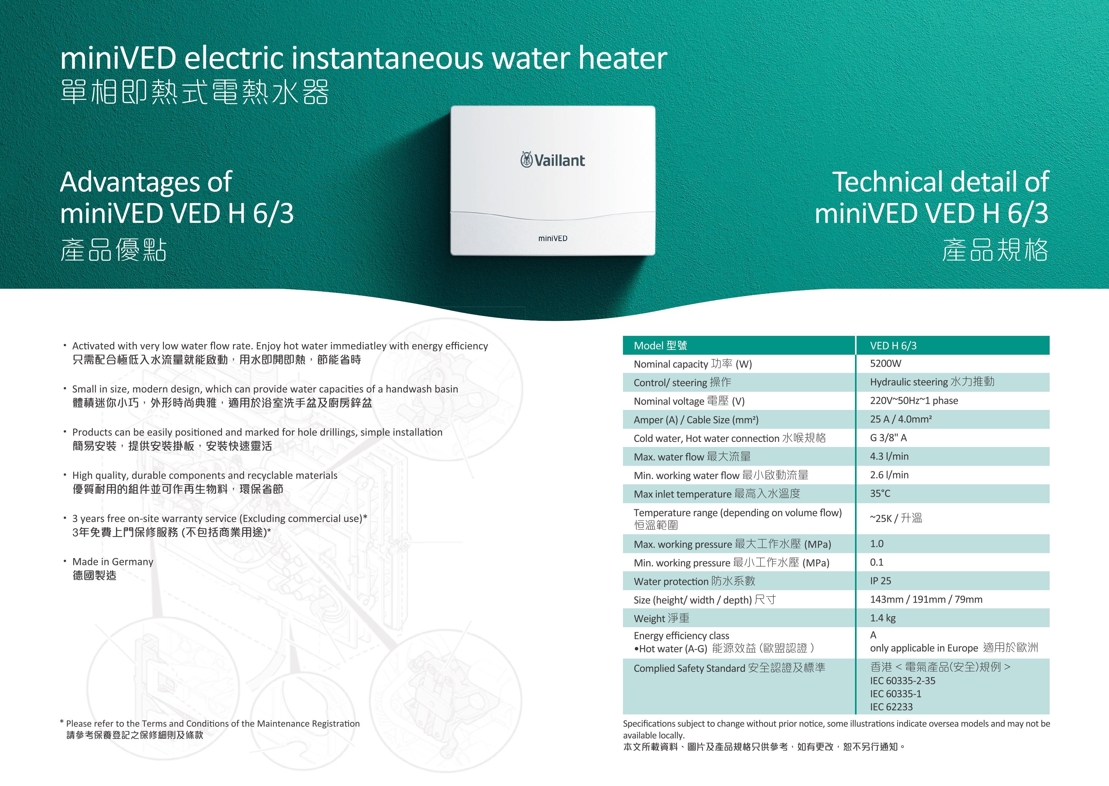 德國威能 Vaillant VED H6/3‧miniVED 迷你單相即熱式電熱水器‧德國製造‧香港行貨,原廠3年保養‧