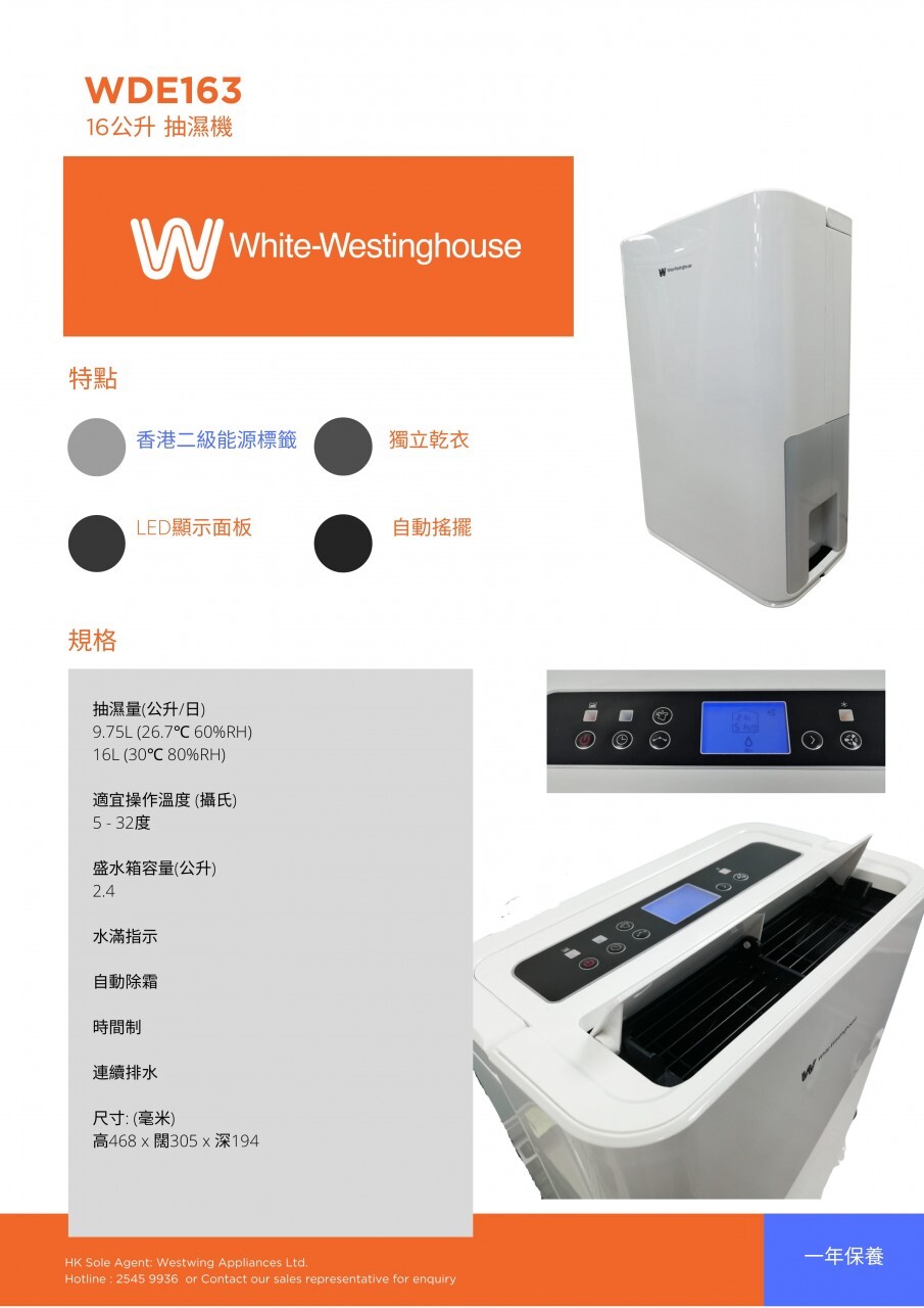 威士汀 White-Westinghouse WDE163‧16公升/日‧時間制壓縮式抽濕機‧香港行貨,原廠1年保養‧