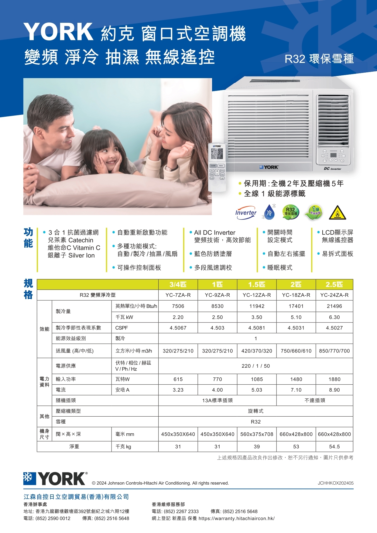 約克 York YC-18ZA-R‧2匹 R32 變頻淨冷‧無線搖控‧窗口式冷氣機‧香港行貨,原廠2年全機及壓縮機5年保養‧
