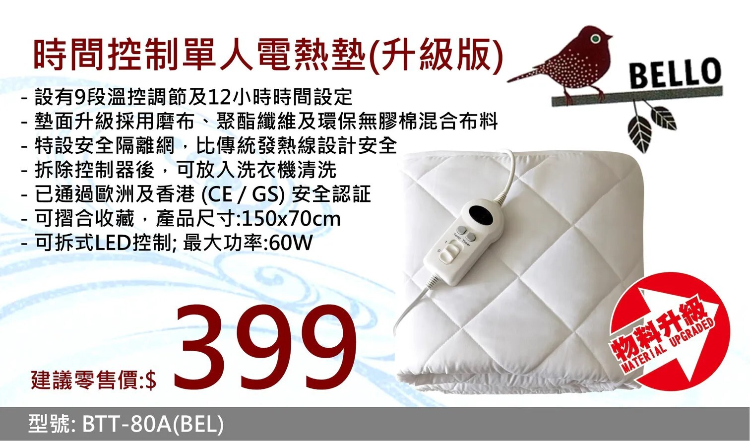 2.若怕弄污,可在電熱氈上鋪床單而非床墊,避免過熱。