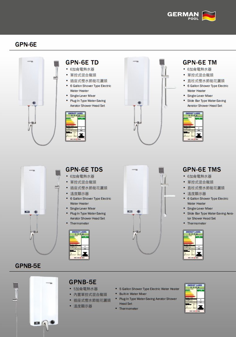 德國寶GPN系列花灑式電熱水器採用德國先進科技,根據國際標準(IEC)生產而成,不單高速製熱,而且榮獲一級能源標籤,節能慳水。配合日本不鏽鋼內膽物料、法國溫度調節技術及度身設計慳水節能花灑頭,GPN系列花灑式電熱水器是你先進靈活的選擇。