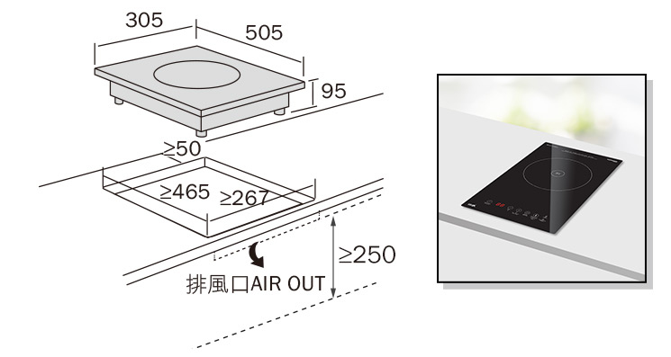 安裝嵌入式電磁爐時機底必須預留不小於250mm的散熱空間,空間不建議密封。