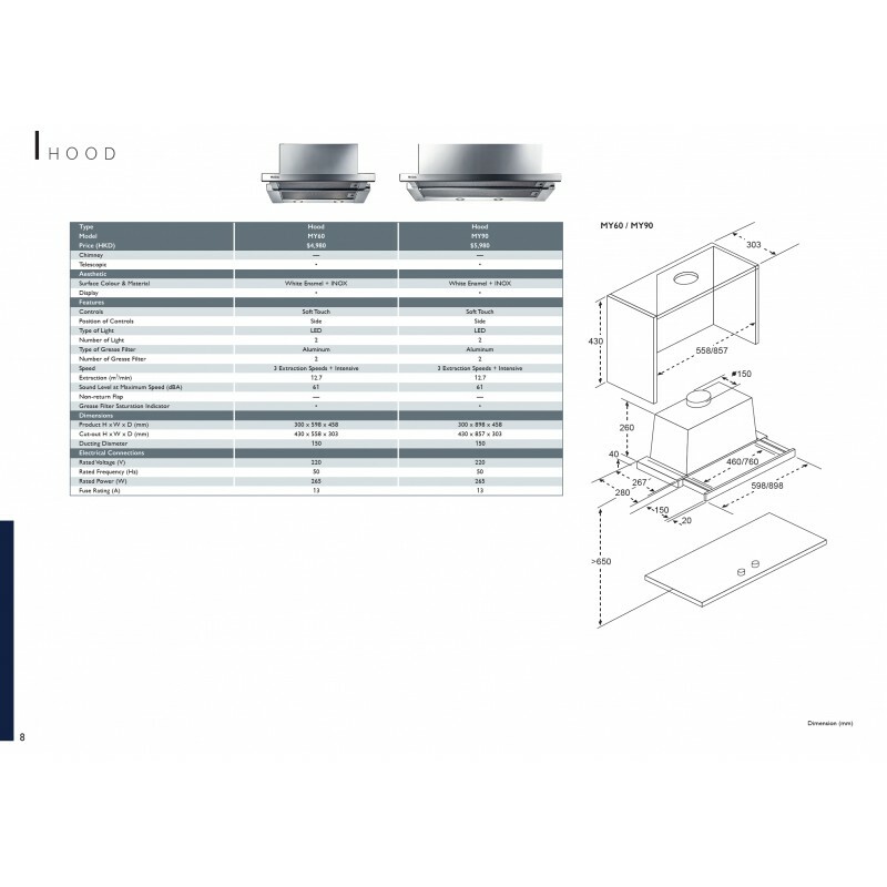 Mia Cucina MY90‧900mm 拉趟式抽油煙機‧意大利製造‧香港行貨,原廠1年保養‧