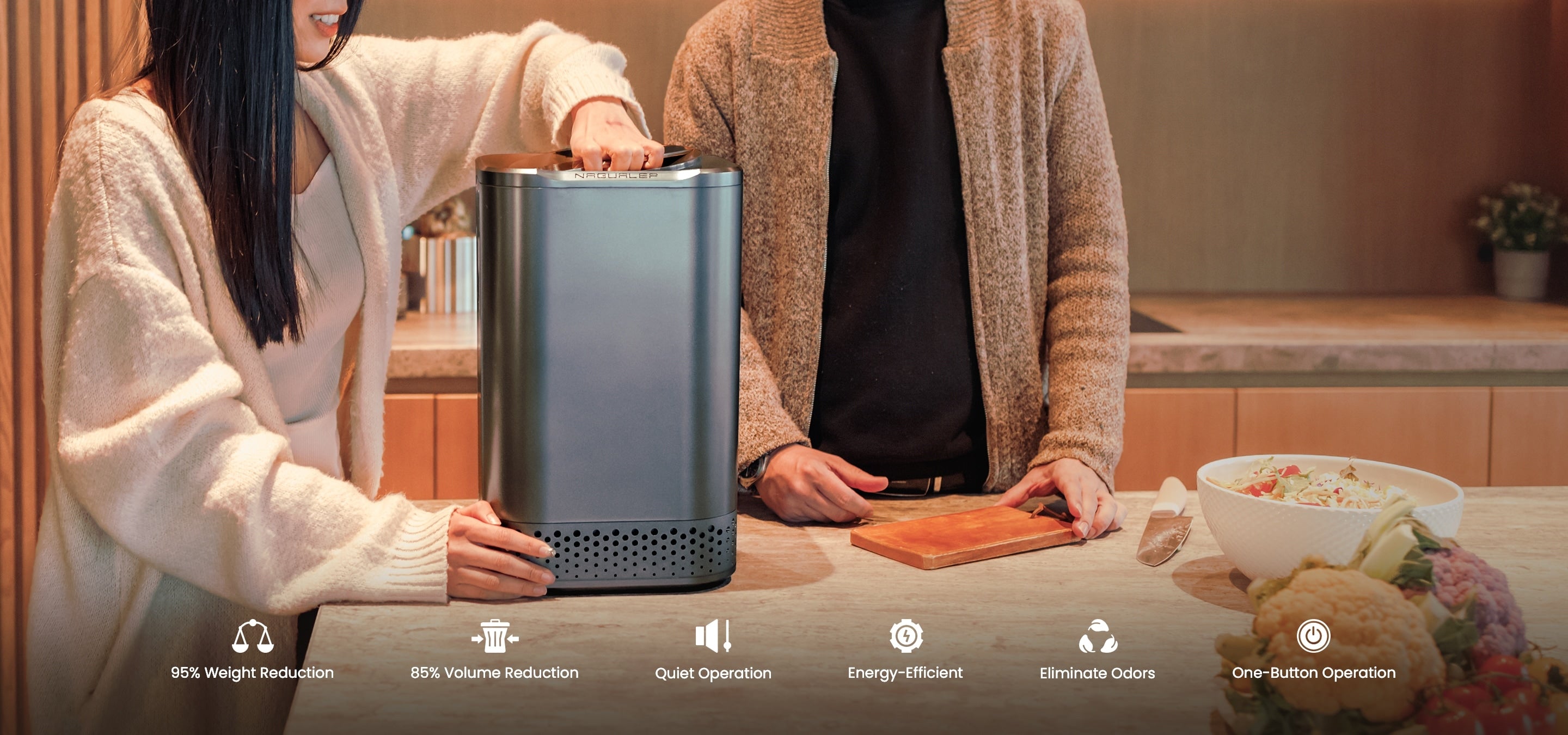 平時總是有吃不完的剩菜、剩米飯、熟食、剩肉、骨頭、龍蝦、貝殼類海鮮、臭豆腐、咖啡碴、和茶葉等等,全部輕鬆放入 NAGUALEP 家用廚餘機!126度高溫殺菌烘乾處理技術,輕鬆縮減90%廚餘重量,配合內置去菌除臭活性碳濾芯,只需1-5小時 讓家中吃不完的廚餘全部變為無臭乾燥土屑,作為植物肥料的原材料