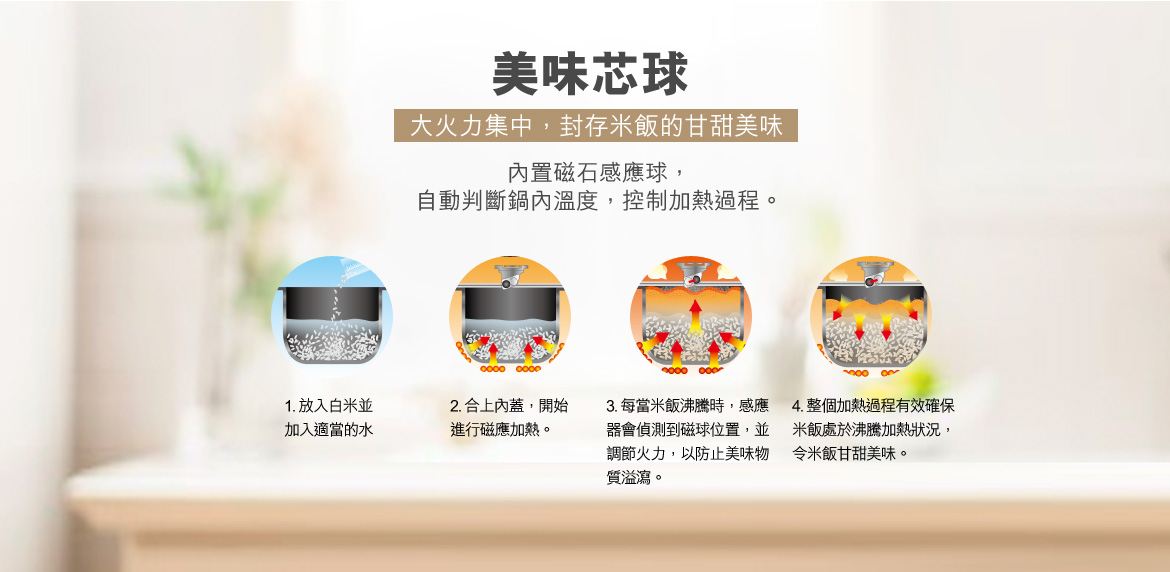 • Panasonic美味芯球技術,自動調節鍋內溫度和加熱火力,封存米飯甘甜美味