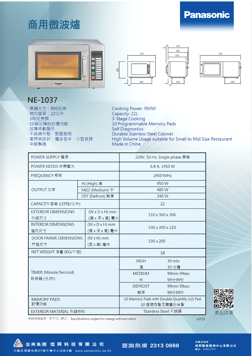 樂聲 Panasonic NE-1037‧商用微波爐‧22公升‧香港行貨,香港及澳門原廠1年保養‧