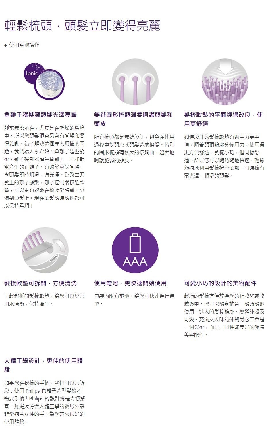 如果您在找梳的手柄,我們可以告訴您:使用 Philips 負離子造型髮梳不需要手柄!Philips 的設計總是令您驚喜。無縫及符合人體工學的弧形外殼非常適合女性的手,為您帶來很好的使用體驗。