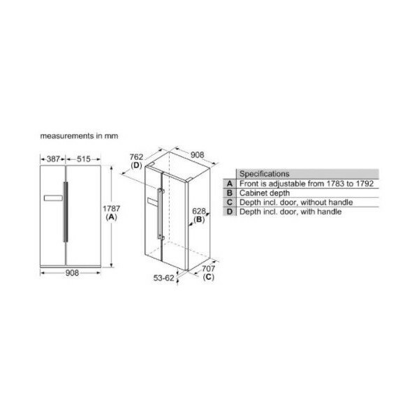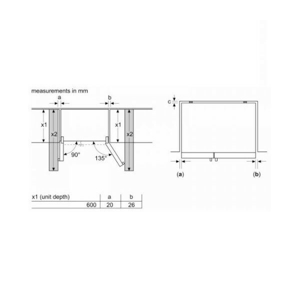 深度包括後方28毫米空位作通。廚櫃內安裝建議預留最少通風位,高:60mm,兩側:最少25mm每邊,雪櫃門鉸須設於廚櫃機外。