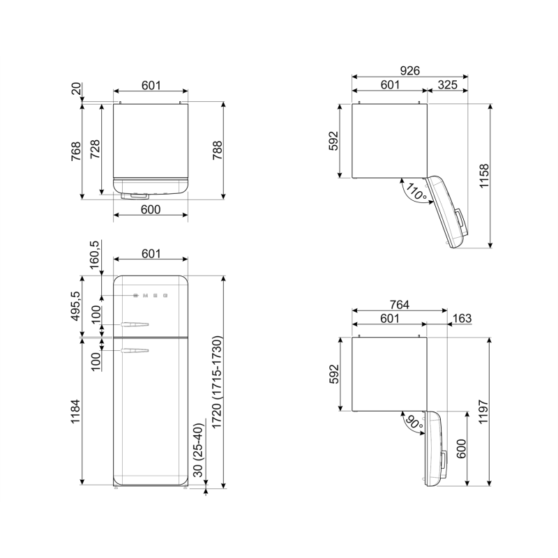 -門打開 90° 時的產品深度:1197 毫米