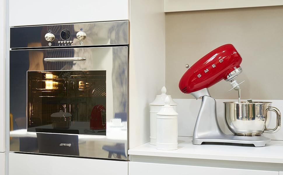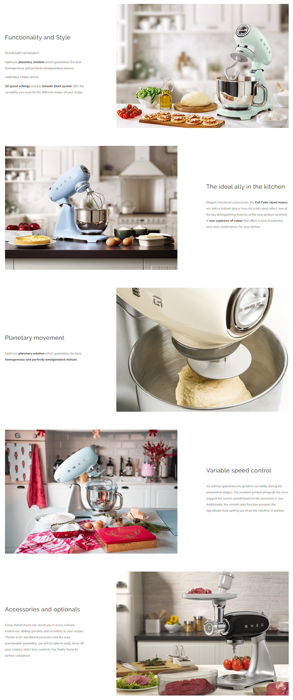 意大利 Smeg 50 年代復古廚師機 , 滿足廚房多種功能需求, 提供 10檔調速, 800瓦大功率 , 利用行星軌跡打發系統, 金屬機身和不鏽鋼大容量容器