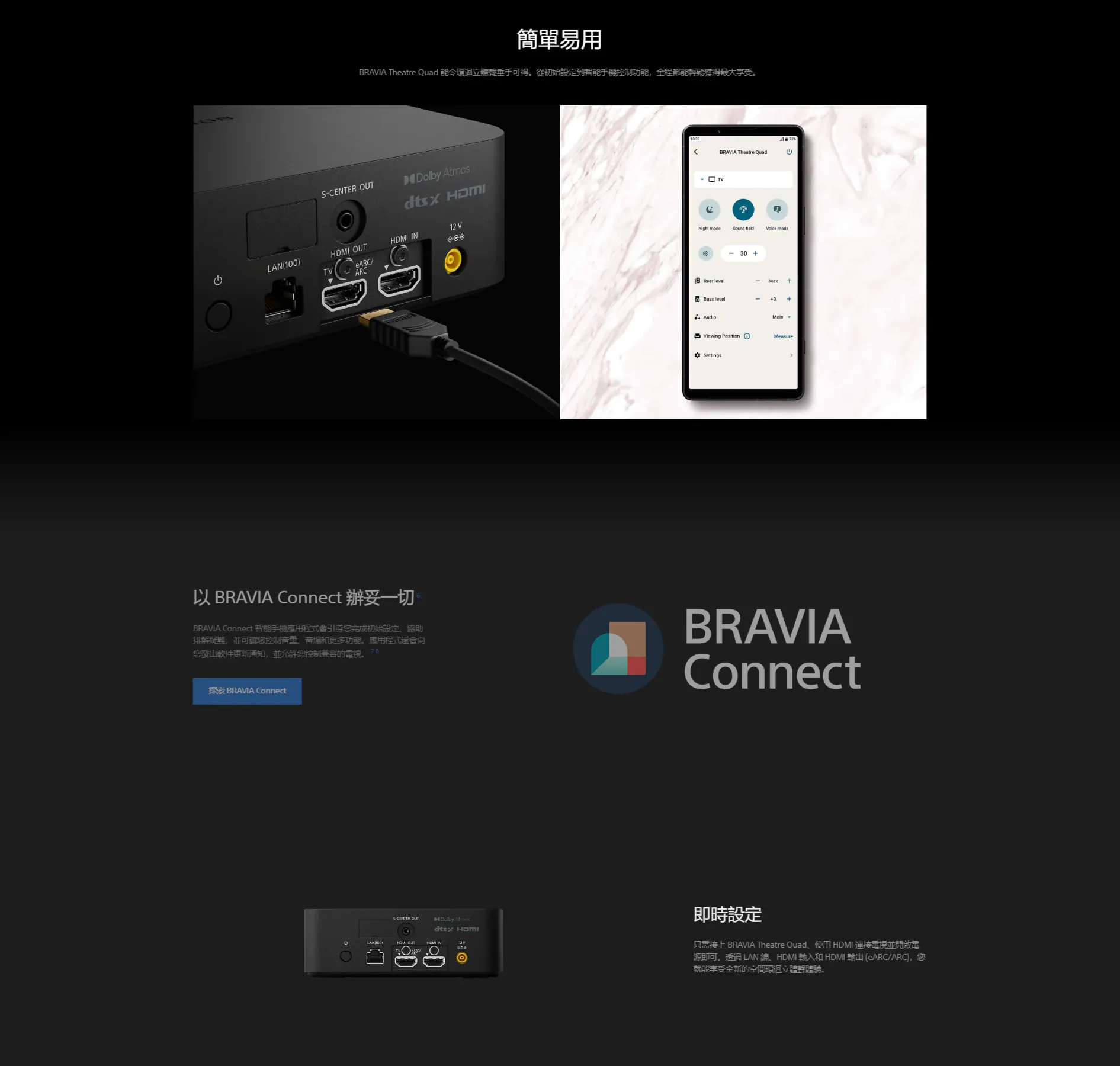 BRAVIA Theatre Quad 能令環迴立體聲垂手可得。從初始設定到智能手機控制功能,全程都能輕鬆獲得最大享受。