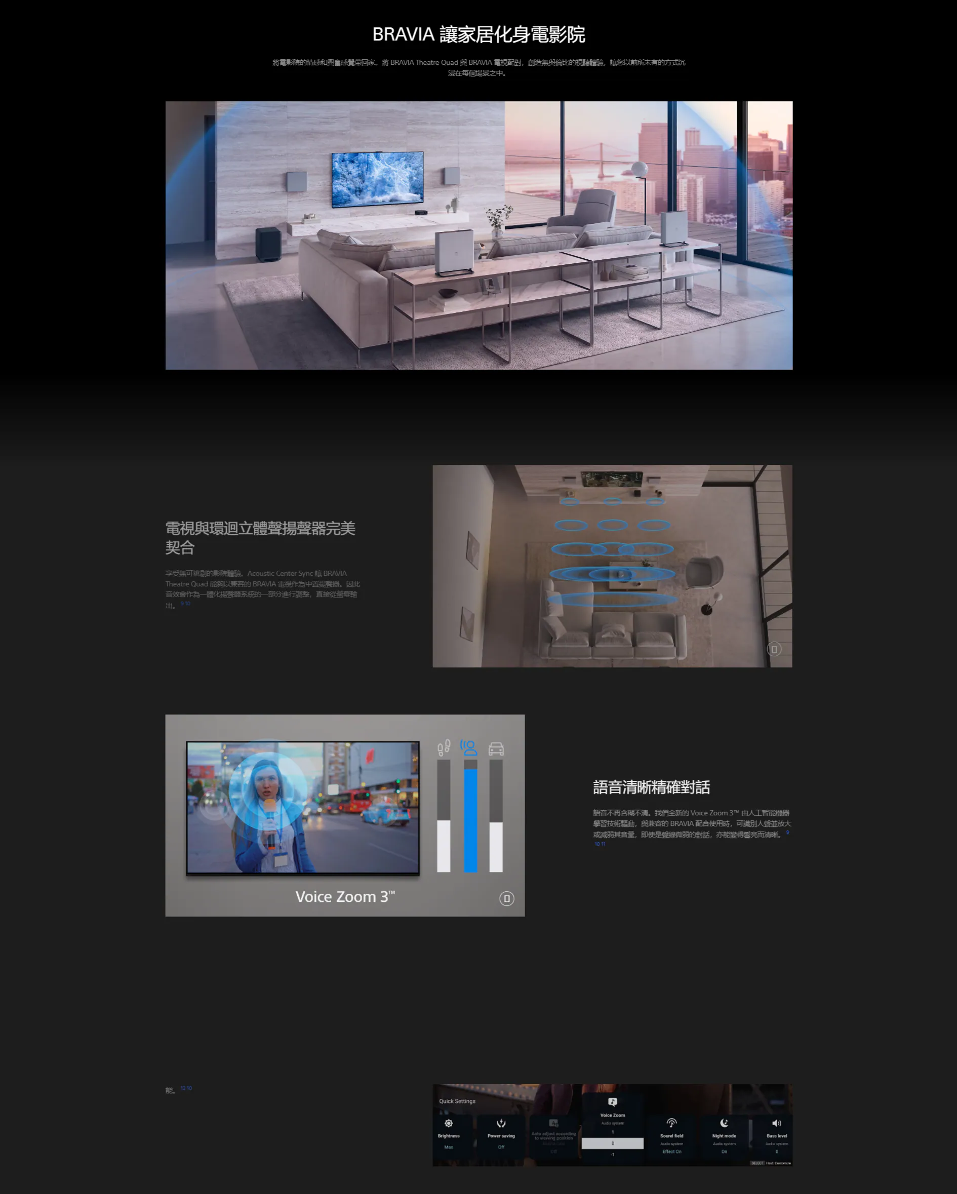 享受無可挑剔的影院體驗。Acoustic Center Sync 讓 BRAVIA Theatre Quad 能夠以兼容的 BRAVIA 電視作為中置揚聲器。因此音效會作為一體化揚聲器系統的一部分進行調整,直接從螢幕輸出